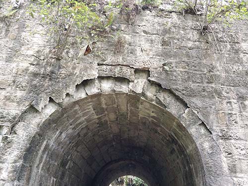 拱涵高5.6米,跨徑2.9米,總長10.2米,結(jié)構(gòu)為漿砌條石。因修建年代久遠(yuǎn),且后期道路于涵頂處加高,加上拱涵排水不暢和日益增多的重型車輛通行導(dǎo)致兩座拱涵出現(xiàn)縱向貫通裂縫、拱頂側(cè)墻外移錯(cuò)位等病害。拱涵進(jìn)出口端采用30cm厚鋼筋混凝土面層,并設(shè)置Φ32拉桿對(duì)拱涵側(cè)墻進(jìn)行加固,采用25cm厚鋼筋混凝土內(nèi)襯套拱對(duì)涵體進(jìn)行補(bǔ)強(qiáng)處理。
